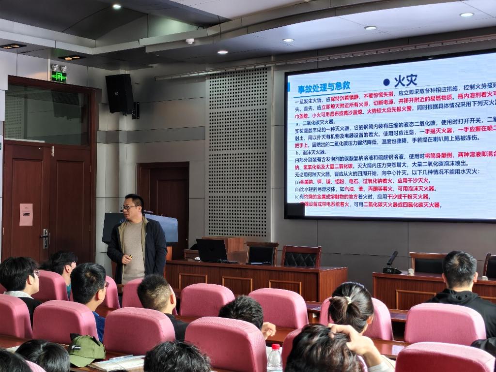 在个人防护安全培训环节,主讲人朱恒忠老师具体讲解了实验室安全十大准则、实验室设备使用安全、实验室安全标志、事故处理与急救等内容,强调“防护到位,安全第一”,杜绝因防护不当引发安全事故。同时,围绕危化品的分类、储存、领用、使用、废弃处理等全流程管理要求,进行了全面讲解。