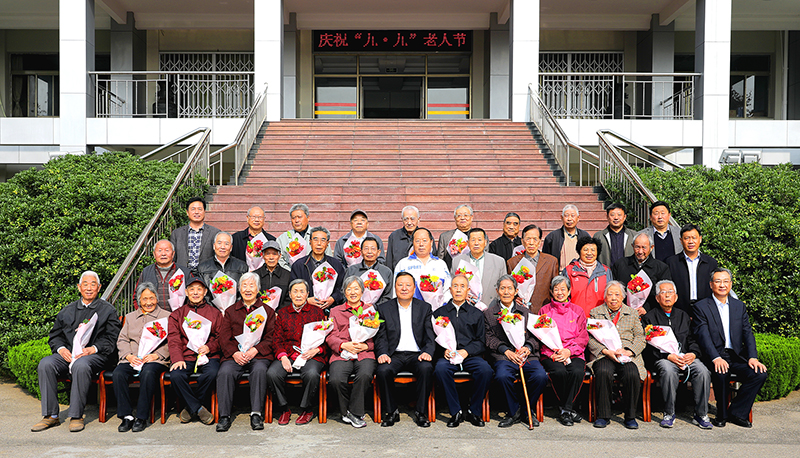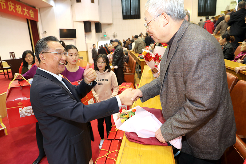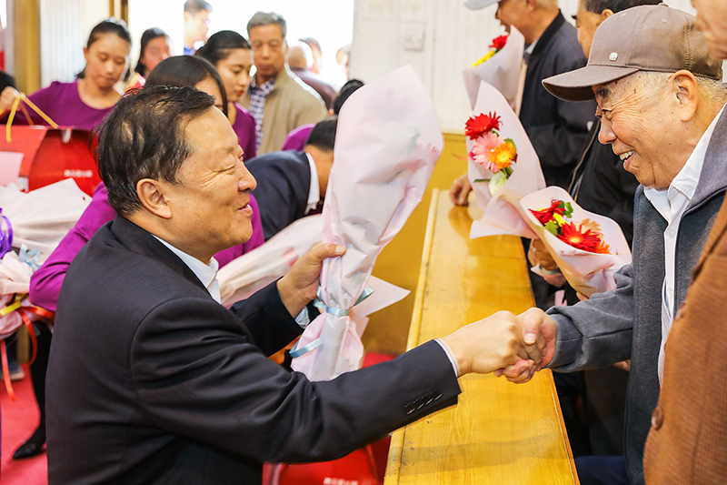 与会领导为年满70岁、80岁、90岁的老同志送上鲜花和节日礼物,并与老同志合影留念。